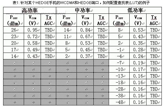 表1所示為針對某個HEDGE手機(jī)的WCDMA和HEDGE端口,如何配置查找表(LUT)的例子。該表格針對Avago的3G功率放大器,分為高、中和低功率模式三個主要部分。其它功率放大器因結(jié)構(gòu)不同而具有不同的設(shè)置。高、中和低功率模式分區(qū)下各列內(nèi)容為該模式下的輸出功率及其相應(yīng)的VCON 電壓,這些電壓是基帶處理器生成的電壓,通知FAN5904為功率放大器提供正確的輸出電壓,獲得特定的輸出功率。GSM和EDGE則需要不同的查找表。