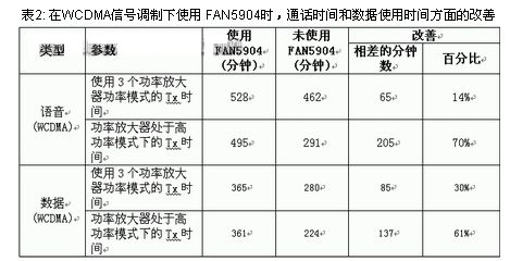 表2顯示了圖1和圖2的結(jié)果,以及功率放大器只工作于高功率模式下相應(yīng)的分鐘數(shù)。在HSUPA、CDMA200 1x EV-DO和TD-SCDMA等不同信號調(diào)制模式下,電流消耗和通話時間都有類似的改善。這里把高功率模式工作的通話/數(shù)據(jù)使用時間一起顯示的原因是:新技術(shù)不僅得到了更多的分鐘數(shù),從設(shè)計角度來看,亦簡化了校準(zhǔn)工作。當(dāng)功率放大器具有多種功率模式時,固件必需適應(yīng)何時從一個等級切換到下一個等級,因?yàn)樵谡麄€輸出功率范圍內(nèi),每個功率放大器的每種功率模式都存在獨(dú)特的VPA-POUT 曲線。由于現(xiàn)在大多數(shù)手機(jī)都支持至少三個頻段,這意味著滿足要求的系統(tǒng)中可能有三種3G功率放大器,所以增加了復(fù)雜程度。在處于一種功率模式的功率放大器中使用FAN5904,可以消除模式切換帶來的復(fù)雜性,更快地進(jìn)行功率放大器校準(zhǔn),因?yàn)樾枰男?zhǔn)點(diǎn)較少。這樣就縮短了測試/校準(zhǔn)的時間,并且降低了制造成本,同時簡化了設(shè)計過程。