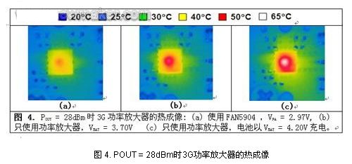 一個時常被忽視,但經(jīng)常遭到抱怨的參數(shù)是耗熱問題。在手持電話貼近頭部進(jìn)行通話,使用手機(jī)網(wǎng)上沖浪或者玩在線網(wǎng)絡(luò)游戲時手機(jī)發(fā)熱,大多數(shù)用戶會因此而感到煩惱。問題的關(guān)鍵在于,設(shè)計人員在設(shè)計手機(jī)時必需將這一因素考慮在內(nèi)。圖4所示為某3G功率放大器的熱成像,其中,(a)為使用FAN5904來供電;(b)為直接與電池連接;(c)為電池以4.2V電壓充電。使用FAN5904時,在滿輸出功率情況下,功率放大器的溫度幾乎不可能達(dá)到50?C,在(b)和(c)的情況下,溫度很容易達(dá)到50?C和65?C,使用一段時間后,手機(jī)會很快發(fā)熱。在數(shù)據(jù)卡應(yīng)用中,尤其是3G USB調(diào)制解調(diào)器卡開始流行,熱耗散,或者說實(shí)現(xiàn)熱耗散最小化變得十分重要。USB卡不能像手機(jī)那樣有效地散熱,因?yàn)樗捏w積非常小。由于3G調(diào)制解調(diào)器主要用于數(shù)據(jù),功率放大器在大部分時間運(yùn)行于“發(fā)熱”狀態(tài)。減少這種熱量的最有效方式是使用諸如FAN5904的降壓轉(zhuǎn)換器。