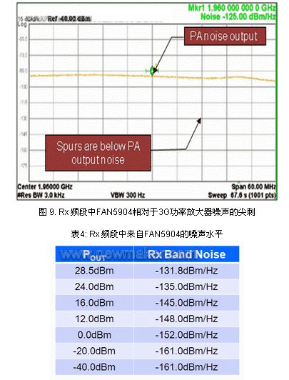 為了進(jìn)一步了解降壓轉(zhuǎn)換器帶來的噪聲/尖刺情況,根據(jù)3G功率放大器自身的噪聲輸出,對接收頻段內(nèi)的噪聲進(jìn)行了測量和比較。圖9顯示在28.5dBm的最高輸出功率下,來自FAN5904的尖刺水平實(shí)際上遠(yuǎn)遠(yuǎn)低于功率放大器的噪聲水平,表4顯示,來自FAN5904 的噪聲在-131.8dBm/Hz處最大,但仍然遠(yuǎn)遠(yuǎn)低于功率放大器自身的-90dBc。RF工程師可以放心,F(xiàn)AN5904在PWM和PFM模式工作時不會對蜂窩和其它RF頻譜的發(fā)送和接收頻段造成干擾。