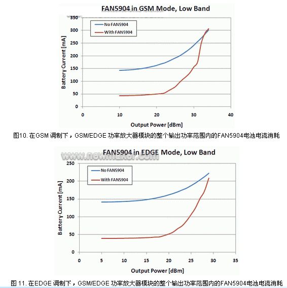 最后一個重要特性是,F(xiàn)AN5904控制GSM/EDGE功率放大器模塊的能力在于將RF功率管理解決方案從 FAN5904分離出來。在GSM/EDGE模式下,F(xiàn)AN5904具有3A的設(shè)計峰值極限電流,因而能夠控制電流高達(dá)2A的功率放大器模塊。在GSM /EDGE模式下,由于電流負(fù)載更大,F(xiàn)AN5904總是以PWM方式工作,因?yàn)镚SM和EDGE信號較3G信號具有更高的輸出功率水平,因此它以 3MHz的頻率進(jìn)行開關(guān)。3MHz是合適的開關(guān)頻率,因?yàn)樗挥赪CDMA通道帶寬之外,但是仍然可以使用小電感和小電容來處理更大電流負(fù)載,并使效率維持在高達(dá)95%的水平。人們可能要問,為什么在該模式下不使用6MHz,這在設(shè)計上是不可行的,因?yàn)檩^大的電流負(fù)載會使開關(guān)損耗更高,小型化解決方案帶來的好處在效率方面得不到補(bǔ)償。圖10和圖11顯示,在蜂窩設(shè)備處于GSM或EDGE模式下,使用FAN5904可將電流降低100mA。