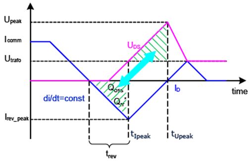 點(diǎn)2時(shí),MOSFET通道關(guān)斷,然而,在輸出扼流圈的驅(qū)動(dòng)下,電流不得不繼續(xù)流動(dòng)。這迫使電流轉(zhuǎn)而流向MOSFET的體二極管,使得開(kāi)關(guān)發(fā)生負(fù)電壓降UD。在圖2中,這段時(shí)間被標(biāo)記為tD。在點(diǎn)3開(kāi)啟一次側(cè)之后,電流不得不下降。如果一次側(cè)MOSFET的開(kāi)啟速度很快,那么,二次側(cè)的環(huán)路電感將限制電流換向,從而形成恒定的di/dt。在這個(gè)階段(tramp),漏源電壓波形會(huì)出現(xiàn)一個(gè)MOSFET的源極電感造成的電壓降,并且受負(fù)di/dt的影響,漏源電壓現(xiàn)在也轉(zhuǎn)為正向。當(dāng)電流穿過(guò)零位線(點(diǎn)4)后,電流不再流經(jīng)體二極管。因此,二極管上的正向壓降也變?yōu)榱?,?dǎo)致UDS波形再次發(fā)生一個(gè)值為體二極管正向壓降UD的正向壓降。穿過(guò)零位線后,電流以不變的di/dt保持流動(dòng)。不過(guò),現(xiàn)在電流的方向?yàn)樨?fù),正在將體二極管的反向恢復(fù)電荷Qrr*移走,并對(duì)MOSFET的輸出電容Coss充電。在這種情況下,Qrr*僅被視為MOSFET體二極管的反向恢復(fù)電荷,而數(shù)據(jù)手冊(cè)中的Qrr則是按照J(rèn)EDEC標(biāo)準(zhǔn)測(cè)得的,因此,除體二極管Qrr*之外,還包含部分MOSFET輸出電荷Qoss(詳細(xì)情況請(qǐng)參見(jiàn)第4節(jié))。在對(duì)Coss充電的同時(shí),MOSFET的電壓也開(kāi)始朝著變壓器電壓升高。點(diǎn)5時(shí),達(dá)到最高反向電流Irev_peak,也就是說(shuō),經(jīng)過(guò)充電現(xiàn)在Coss已經(jīng)達(dá)到變壓器電壓。在理想狀況下,這個(gè)系統(tǒng)現(xiàn)在應(yīng)當(dāng)處于穩(wěn)定狀態(tài),但是,系統(tǒng)中仍然存在如下電量: