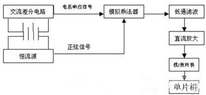 為了解決上述各方法的缺陷,本文采用了四端子測(cè)量方式,將蓄電池兩端上的電壓響應(yīng)信號(hào)通過交流差分電路與產(chǎn)生恒定交流源的正弦信號(hào)經(jīng)過模擬乘法器相乘,再將模擬乘法器的輸出電壓信號(hào)通過濾波電路,使交流信號(hào)轉(zhuǎn)變?yōu)橹绷餍盘?hào),直流信號(hào)經(jīng)直流放大器放大后進(jìn)行模數(shù)轉(zhuǎn)換,將轉(zhuǎn)換后的值送入單片機(jī)進(jìn)行簡(jiǎn)單處理。