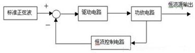 電路組成框圖如圖2所示:這是一個(gè)閉環(huán)控制系統(tǒng),電流負(fù)反饋電路。標(biāo)準(zhǔn)正弦波產(chǎn)生一個(gè)頻率穩(wěn)定、對(duì)稱、失真度低的1KHz正弦波信號(hào)。驅(qū)動(dòng)電路把正弦波放大,去推動(dòng)功放電路,得到正弦交流電流輸出。恒流控制電路從功放輸出中得到的信號(hào),通過與給定的信號(hào)相比較,來調(diào)節(jié)驅(qū)動(dòng)電路的信號(hào),從而使輸出電流保持穩(wěn)定。