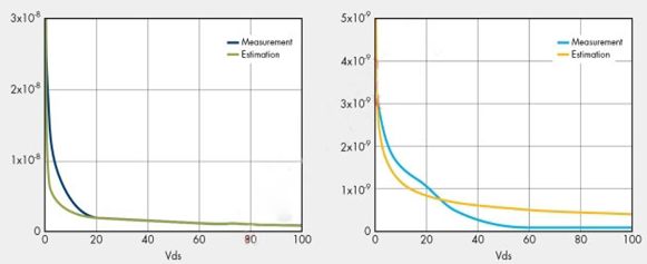 圖2(a)顯示了輸出電容的測(cè)量值及由公式(3)得出的擬合曲線。然而,對(duì)于具有更多非線性特性的新式超級(jí)結(jié)MOSFET而言,則簡(jiǎn)單的指數(shù)曲線擬合有時(shí)不夠好。圖2(b)顯示了最新技術(shù)MOSFET的輸出電容測(cè)量值及用公式(3)得出的擬合曲線。兩者在高壓區(qū)的差距將導(dǎo)致等效輸出電容的巨大差異,因?yàn)樵诜e分公式中電壓與電容是相乘的。圖2(b)中的估計(jì)將得出大得多的等效電容,這會(huì)誤導(dǎo)轉(zhuǎn)換器的初始設(shè)計(jì)。