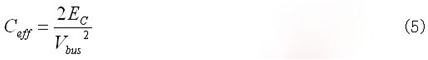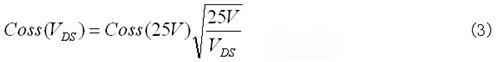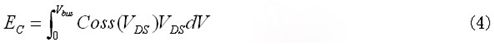 如果依據(jù)漏源電壓變化的輸出電容值可得,則輸出電容儲(chǔ)能可用公式(4)求出。雖然電容曲線顯示在數(shù)據(jù)表中,但要想從圖表中精確讀出電容值并不容易。因此,依據(jù)漏源電壓變化的輸出電容儲(chǔ)能將由最新功率MOSFET數(shù)據(jù)表中的圖表給出。通過(guò)圖3顯示的曲線,使用公式(5)可以得到期望的直流總線電壓下的等效輸出電容。