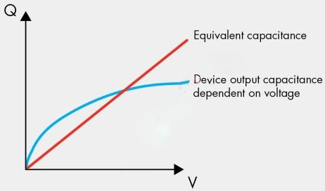 在電壓與電荷關(guān)系圖(圖1)上,電容為直線的斜率,電容中的儲(chǔ)能為該直線下包含的面積。雖然功率MOSFET的輸出電容呈非線性,并依據(jù)漏源電壓的變化而變化,但是輸出電容中的儲(chǔ)能仍為非線性電容線下的面積。因此,如果我們能夠找出一條直線,由該直線給出的面積與圖1所示變化的輸出電容曲線所包含的面積相同,則直線的斜率恰好是產(chǎn)生相同儲(chǔ)能的等效輸出電容。