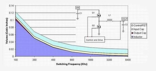 我們以濾波器組件作為開始。這些組件占據(jù)了電源體積的大部分,同時濾波器的尺寸同工作頻率成反比關(guān)系。另一方面,每一次開關(guān)轉(zhuǎn)換都會伴有能量損耗;工作頻率越高,開關(guān)損耗就越高,同時效率也就越低。其次,較高的頻率運行通常意味著可以使用較小的組件值。因此,更高頻率運行能夠帶來極大的成本節(jié)約。