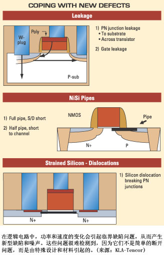 涉足尖端技術研究工作的芯片制造商正在把無數新材料和奇特的器件結構結合起來,用于65nm及更低節(jié)點的量產。同時他們發(fā)現,在這些研究上的努力生產的結果還包括目前必須著手解決各器件各個層上出現的越來越多的細微的電缺陷和微小物理缺陷。在存儲器中,可能會出現多晶硅阻塞管道問題poly-plug piping problems,從而引起B(yǎng)PSG(硼磷硅酸鹽玻璃)孔隙問題。在邏輯領域,使用應變硅引起的應變硅位錯可能產生缺陷,有時這類缺陷直到后道工藝才顯露出來。