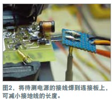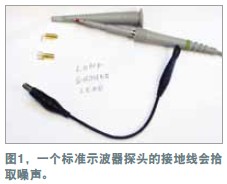 在測量電源軌的紋波時(shí),必須盡量減小噪聲,因?yàn)榧y波幅度可能很小。示波器探頭是基本的測量工具,但它們可能引入噪聲與誤差。地線(如與標(biāo)準(zhǔn)示波器探頭連接的那根線)可能增加一些不會出現(xiàn)在示波器軌跡上的電路噪聲。線路環(huán)就像一根天線,會提取周圍的雜散磁場。環(huán)路面積越大,提取的噪聲就越多。為證明這個(gè)理論,可將示波器地線連接到探頭尖端,然后到處移動(dòng)。示波器會隨著地線的移動(dòng)而顯示出噪聲的增減。用一個(gè)示波器探頭及其地線和插座可以做一個(gè)簡單的連接板(圖1)。