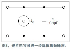 電容應(yīng)采用多層堆疊式的瓷片電容,因?yàn)樗芨玫厝ヱ罡哳l噪聲。電解電容、紙電容以及塑料薄膜電容都有兩片金屬箔。金屬箔由一片電介質(zhì)分隔開,這三部分構(gòu)成一個(gè)卷狀物。這種結(jié)構(gòu)有自身的電感;因此,當(dāng)頻率高于數(shù)兆赫茲時(shí),它更類似于一只電感,而不是電容。圖4顯示了各種堆疊式瓷片電容值對電源的阻抗。