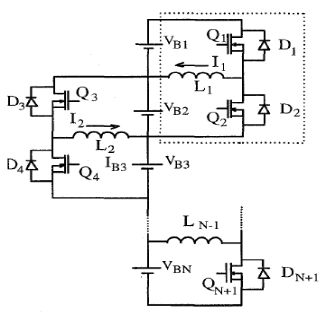 開關電感法可以實現(xiàn)相鄰電池單體間能量的同時傳遞,可以減少均衡時間,對于N 個蓄電池單體,需要2N-2 個MOSFET 和N-1 個電感。