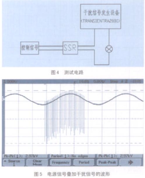圖4 所示為測試電路。對SSR 來說,有信號源(穩(wěn)壓電源)、小于1 米的連線、負載及有關儀器;圖5 為電源信號疊加干擾信號的波形。