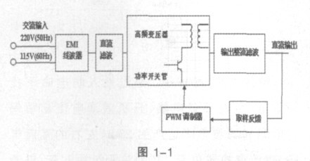以上四種調(diào)制方式以脈沖調(diào)寬開關(guān)電源在實際應(yīng)用中最為廣泛?;緲?gòu)成如圖1- 1 所示,主要由以下6 部分組成。