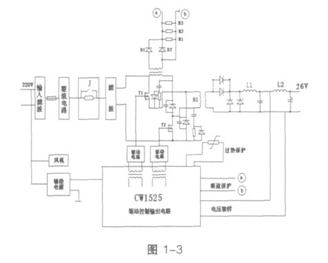 以上是開關(guān)電源基本原理和控制方式的介紹,結(jié)合我們實際工作中固態(tài)發(fā)射機(jī)開關(guān)電源控制方式以及理論理解,使我對大功率開關(guān)電源原理、整體控制方式有了進(jìn)一步的認(rèn)識?,F(xiàn)以5kW- 14CH 大功率合放式全固態(tài)電視發(fā)射機(jī)直流26V/100A 正激開關(guān)電源變換器的工作原理和維修方法來簡單介紹一下,如圖1- 3 所示: