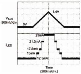 通過將背光調整到合適的水平,就可以顯著減少從電池吸收的功率。圖3顯示了一種使用情況,突出了在5個亮度區(qū)使用系統(tǒng)可能實現(xiàn)的電力節(jié)?。宏柟狻㈥幪焓彝?、明亮的辦公室、昏暗的房間、夜間/電影院。亮度值分別設置為100%、85%、70%、60%和50%(25mA、21.3mA、17.5mA、15mA和12.5mA)。由于ALS的電壓上升(或通過傳感器增加環(huán)境光),在驅動器迫使LED電流變化之前,驅動IC在預定時間內對ALS電壓采樣。規(guī)定(或平均)時間內的ALS電壓采樣有助于防止在瞬息萬變的照明條件下出現(xiàn)LED閃爍。