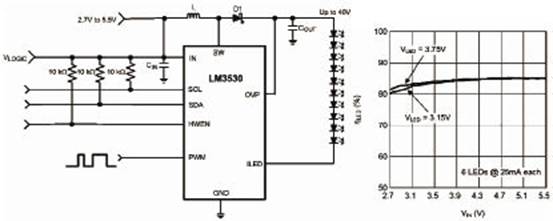 開關式電容的增益量很有限,電感式升壓轉換器具有無限的增益。通過調節(jié)電感式升壓的開關占空比,可以實現(xiàn)支持負載(LED串)所需的確切升壓增益。這種優(yōu)化有助于防止在固定增益躍遷(gain transition)發(fā)生之后,可能在開關式電容升壓右側出現(xiàn)的“過度升壓”。