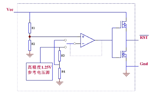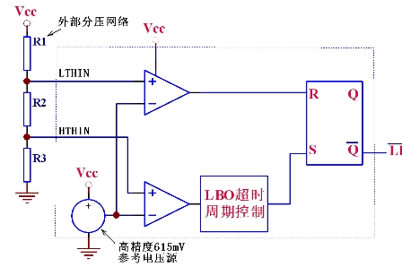 IC內(nèi)含一個高精度的615mV基準電壓源、兩個比較器、一個RS觸發(fā)器和其它一些邏輯電路,其大致功能是:VCC電壓或其它待檢測電壓通過R1-R3組成的分壓網(wǎng)絡(luò)接在IC的LTHIN /HTHIN檢測引腳,當待測電壓下降導致LTHIN引腳低于615mV時,輸出腳LBO\輸出低電平,而如果待測電壓上升導致HTHIN引腳高于615 mV時,經(jīng)過內(nèi)部邏輯判斷和簡單延時后,輸出腳LBO\輸出高電平。
