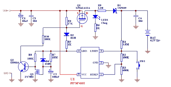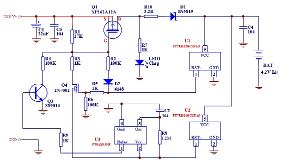 PT7M7433T是上海百利通公司最新設(shè)計的極高精度的一系列電壓檢測器的其中一款,其檢測精度在0-Vcc (5.5V)范圍內(nèi)小于1mV,而且其批量IC的檢測值偏差<±2.5%,這樣完全保證了批量產(chǎn)品的性能一致性和極高的總體性能,我們利用其配合少量外部電路即可組成相當簡單的鋰電池充電線路。