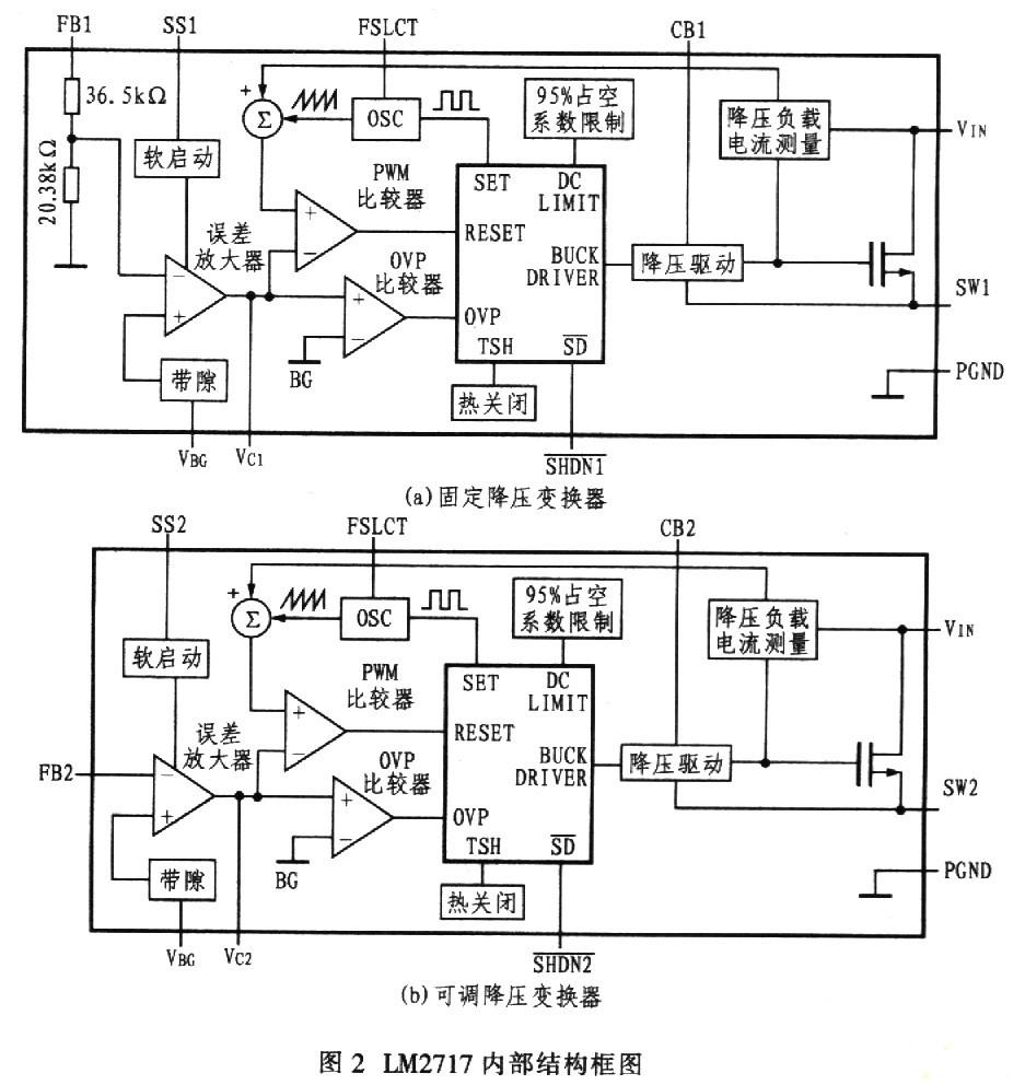 該器件內含電流模式的脈寬調制降壓調節(jié)器。降壓調節(jié)器逐步把輸入電壓降低為一個較低的輸出電壓。在導通模式下(當電感電流在穩(wěn)定狀態(tài)下恒不為零時),降壓調節(jié)器有兩個工作周期。電源開關連接在VIN和SWl、SW2引腳之間。