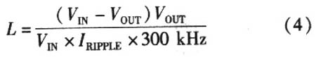 電感的關鍵參數(shù)是電感系數(shù)、峰值電流和直流阻抗。電感系數(shù)與電感波紋電流峰-峰值、輸入電壓以及輸出電壓有關(工作頻率是300kHz)。即:
