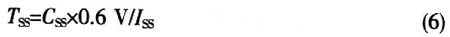 該器件無允許快速啟動的內部軟啟動,但是也會產生大的浪涌電流。因此,對于需要降低浪涌電流的應用,該器件有限制DC/DC轉換調節(jié)器啟動時浪涌電流的電路。浪涌電流限制電路可作為軟啟動。外部的SS引腳用來調節(jié)軟啟動的特殊應用。電流ISS影響外部軟啟動電容器CSS,軟啟動時間計算為: