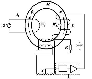 采用與以上信息相對應(yīng)的傳感器和變換器對數(shù)據(jù)進行測量,溫度傳感器采用精密鉑電阻溫度傳感器PT100,該傳感器按照IEC751國際標準設(shè)計和制作,利用鉑電阻在溫度發(fā)生變化時其電阻值也發(fā)生變化的特性來測量溫度,傳感器元件由鉑絲燒制,穩(wěn)定性高,測量范圍廣,利用兩個溫度傳感器可以分別對光伏組件表面溫度和環(huán)境溫度進行測量,將被測溫度轉(zhuǎn)換成(4~20)mA DC二線制標準信號而遠程發(fā)送。電壓的測量采用四通牌ST-A系列的STCV-800電壓傳感器,該系列傳感器廣泛用于電力系統(tǒng)的監(jiān)測,電壓測試范圍分別為0~1200V.直流電流的測量選用武漢儀表公司生產(chǎn)的HD系列高精度直流大電流傳感器。其工作原理如圖2所示。