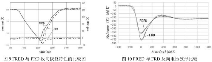 例如FRED就較一般的FRD在恢復時間、反向電壓等方面有一定的優(yōu)勢。圖9是一種國產FRED與進口FRD反向恢復特性的比較,圖10是國產FRED與進口FRD反向電壓波形比較。