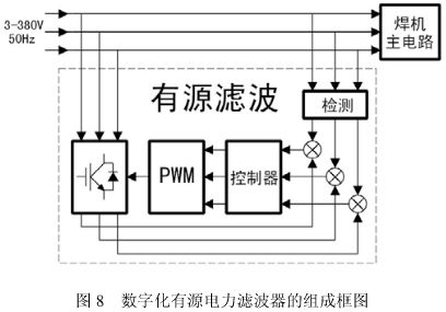 有源濾波器原理如圖 8 所示。通過檢測電路對負載端(焊機主電路)的電壓、電流進行檢測,然后送入控制電路進行計算分析,輸出相應的脈沖驅動 IGBT,產生與負載電流中的諧波電流大小相等方向相反的電流,從而達到補償負載電流中的諧波分量和無功功率的目的。逆變器工作時所需要的能量由儲能電路供給,該儲能電路是通過逆變器中的各個 IGBT 的反并聯二極管進行充電,同時又在 IGBT 開通時輸出能量,使諧波電流分量和無功功率得到補償。這樣,電網的輸入電流可實現為正弦波形。 有源濾波器動態(tài)響應迅速,濾除諧波可達到 95%以上,補償無功細致。但有源濾波器由于電路復雜,材料成本高,運行可靠性也不及無源濾波電路,對市場價格競爭異常激烈的 ZX7、NB 系列逆變焊機而言不太適用,但對需要作精細控制的數字化焊機而言,可能有源濾波才是其最佳選擇。