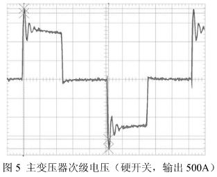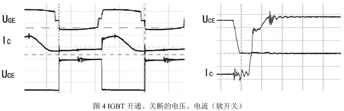 圖4 IGBT開通、關斷的電壓、電流(軟開關) 肖介光等:IGBT逆變焊機電磁騷擾的抑制 同時,由于主變壓器的漏感及分布電容在 IGBT 開通、關斷時,常常產生高頻高壓尖峰震蕩,由此而產生的高次諧波可由多種途徑傳入內部電路,也可通過散熱器及主變壓器等途經向空間輻射。