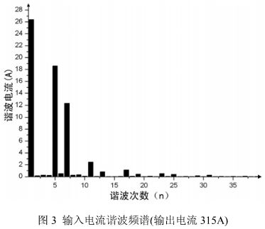 圖 3 是一臺無諧波抑制措施的 IGBT 逆變焊機輸出 315A電流時的輸入電流諧波頻譜, 諧波畸變率高達64%,大大超過了 GB15579.10-2008標準中表 B7諧波畸變率(THD)48%的限值,其 5 次、7 次諧波電流幅值過大是 THD 超標的主要原因,11、13 次諧波電流符合標準限值要求。由此可見,低頻諧波幅值過大是 THD超標的主要原因。同時,諧波畸變率高還會對 IGBT 逆變焊機的全功率因數產生不利影響。