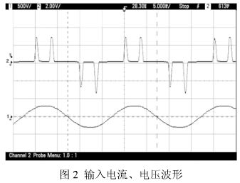 圖 2 是 IGBT 逆變焊機的輸入相電流、電壓波形。由圖 2 可見,輸入電流已不再是正弦波,而是一種前后沿都比較陡峭的脈沖,由整流、濾波引起的電流波形畸變是 IGBT 逆變焊機的共性問題?;兊碾娏鳌㈦妷焊叽沃C波會沿電源電纜、供電網絡產生傳導騷擾和輻射騷擾,由于頻率相對較低,其輻射水平并不會很高。