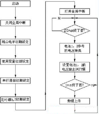 為了驗證本文的均衡充電方法,以兩節(jié)單體電池組成的蓄電池組為例進行實驗和分析,主要驗證旁路中開關管對電壓的調(diào)節(jié)作用??刂屏鞒桃妶D4。
