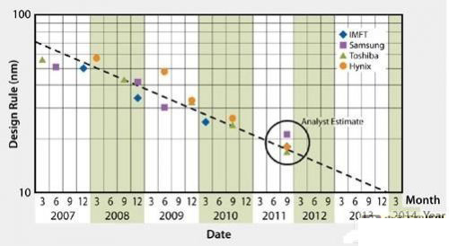 雖然數(shù)碼相機(jī)歷來需要很大的存儲(chǔ)容量,但對(duì)手機(jī)而言,這種要求只是在近幾年才變得重要起來。幸運(yùn)的是,固態(tài)存儲(chǔ)器的密度和容量在逐漸增加,其價(jià)格($/MB)和面積(mm2/MB)隨之大幅降低。從圖1可看出,在2011年,NAND閃存的制造工藝幾何尺寸可能突破25nm。