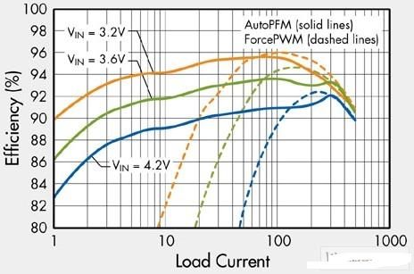 按照表1的計(jì)算,對(duì)于300mA的系統(tǒng),F(xiàn)AN5362能把功耗降至55mW;對(duì)于400mA的系統(tǒng),F(xiàn)AN5362能將功耗降至101mW。這些效率值根據(jù)所測(cè)得的FAN5362效率曲線而獲得。圖5顯示了AutoPFM(實(shí)線) 和 ForcePWM (虛線)的效率曲線。在優(yōu)化FAN5362效率的同時(shí),選擇3MHz作為額定開關(guān)頻率,因?yàn)樗軌蛱峁┏叽绾托手g的最佳權(quán)衡。從表1可看出,對(duì)于這種功耗敏感應(yīng)用,采用6MHz開關(guān)頻率時(shí)的功耗遠(yuǎn)遠(yuǎn)大于采用3MHz開關(guān)頻率時(shí)的功耗。