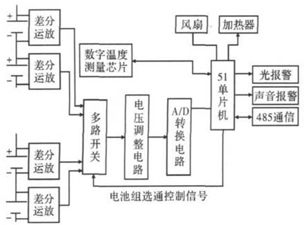 具有高電壓、高容量、循環(huán)壽命長、安全性能好等優(yōu)點的鋰離子電池,在便攜式電子設備、電動汽車、空間技術、國防工業(yè)等多方面具有廣闊的應用前景。由若干節(jié)鋰離子電池經串聯(lián)組成的動力鋰離子電池組目前應用最為廣泛。由于每節(jié)單體電池的電壓不一致,使用中電池不允許過充電、過放電,電池的性能和壽命受溫度影響較大等特點,必須對串聯(lián)鋰離子電池組進行監(jiān)測,確保在使用中鋰離子電池具有良好的狀態(tài),或者使用中電池出現問題立即報警,電源管理系統(tǒng)立即采取保障措施,并提醒相關人員檢修。單體電壓和電池組的溫度是辨別串聯(lián)鋰離子電池組是否正常工作的主要技術指標。采用直接采樣法,將要測量的單體電池電壓存儲在非電容上進行測量。該方法反應時間慢、誤差較大、控制復雜; 采用運放和光藕繼電器來測量串聯(lián)電池組的單體電壓。該方法對光耦的線性度要求很高,導致硬件成本較高。目前,直接采用集成芯片的串聯(lián)鋰離子電池組監(jiān)控系統(tǒng)受到青睞,但該方法串聯(lián)電池的數目固定,導致應用不靈活、硬件成本高等缺點。文中研制了一種動力鋰離子電池組監(jiān)測系統(tǒng),對串聯(lián)鋰離子電池組的單體電壓和電池組的溫度進行在線監(jiān)測,當單體電池電壓偏離規(guī)定區(qū)間時,監(jiān)測系統(tǒng)啟動報警程序進行聲、光報警; 當電池組溫度偏離規(guī)定的區(qū)間時,監(jiān)測系統(tǒng)啟動風扇或加熱控制電路,并存儲有關數據,確保電池組正常工作。整個監(jiān)測系統(tǒng)具有連續(xù)測量分量、簡單經濟、精度高和可靠性高的特點。