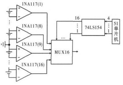 每節(jié)鋰離子電池最高電壓為5 V,由圖3 可得,第1 個INA117 的3 腳的輸入電勢最高為40 V.同理,第16 個INA117 的2 腳輸入電勢最低為- 40 V.第1 至8 個INA117 的輸出電壓為正,第9 至16 個INA117 的輸出電壓為負,所以多選一模擬開關和A/D 轉換器都要求可以輸入正、負電壓。多選一模擬開關選用MUX16,為16 選1 可正負電壓輸入模擬開關,因此16節(jié)電池只需1 個MUX16.但由于單片機IO 口有限,文中用一片74LS154 擴展了IO 口,僅用單片機的4 個IO 口即可控制MUX16 分別選通單節(jié)鋰離子電池進行電壓采樣。