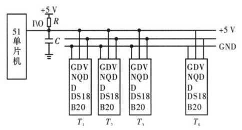 針對串聯(lián)電池組,傳統(tǒng)的測溫方法多采用模擬溫度傳感器進行測量,在數據的采集和傳輸過程中易受外界環(huán)境的干擾,從而使測得的結果誤差較大,且當測量點較多時,連線較復雜。文中采用單片機和單總線數字式溫度傳感器DS18B20 來解決上述問題。其原理如圖5 所示。