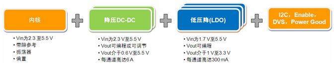 安森美半導(dǎo)體提供一系列的微型電源管理IC(mini-PMIC),其功能示意圖參見圖1。這些微型電源管理IC集成多個DC-DC開關(guān)轉(zhuǎn)換器或低壓降(LDO)線性轉(zhuǎn)換器,同時還可能集成其它多種控制或保護(hù)功能等,如總線控制、排序器、功率良好(PG)監(jiān)控、啟用(Enable)、帶隙參考、振蕩器、欠壓鎖定及熱關(guān)閉等保護(hù)功能或動態(tài)電壓調(diào)節(jié)(DVS)等。安森美半導(dǎo)體的mini-PMIC目前包括NCP6922、NCP6914、NCP6924及NCP69xy等(功率及功能遞增)。