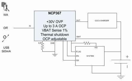 以NCP367為例,這是一款提供+30 V過壓保護(hù)及高達(dá)3 A過流保護(hù)、帶電池電壓檢測功能的保護(hù)IC(見圖5)。這器件保護(hù)便攜設(shè)備電池免受輸入過壓(在出現(xiàn)故障工作條件下會斷開系統(tǒng)與Vbus或AC-DC適配器的連接)、充電過流及充電過壓影響。NCP367提供最大值100 mΩ的低導(dǎo)通阻抗,幫助降低方案成本及電路板占用空間。支持高達(dá)3 A電流的能力幫助實現(xiàn)快速充電。典型值50 μA的極低電流消耗兼容于USB 500 μA閑置模式。這器件能用于1.5 A或500 mA兩種充電電流等級,非常適合手機等應(yīng)用。