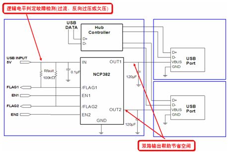 NCP382則是一款功率分配開關(guān),其設(shè)計針對很可能會遇到大的電容性負(fù)載或短路的應(yīng)用。實際上,越來越多便攜電子設(shè)備采用USB供電,但需要保護(hù)本地USB電源夠用受外部Vbus故障影響。NCP382能夠通過在輸出負(fù)載超過限流閾值或出現(xiàn)短路時切換至恒流模式,將輸出電流限制在期望的電平(0.5 A、1 A或1.5 A),從而提供過流保護(hù)。NCP381接收2.5 V至5.5 V的單路輸入,提供2路輸出。圖6是NCP382的典型應(yīng)用電路圖。