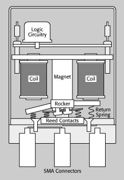 繼電器內的容性是限制開關的信號頻率的常見因素。繼電器的材料和物理特性決定了其構成的內部電容。比如,在超過40GHz的射頻和微波開關中,在機電繼電器中采用了特殊的接觸架構來獲得更好的性能。圖1顯示了一個典型的構造,共同端接位于兩個開關端接之間。所有信號的連接線路都是同軸線,來保證最佳的信號完整性(SI)。在這種情況下,連接器是SMA母頭。對于更加復雜的開關結構,共同端接被各個開關端接以放射狀圍繞。