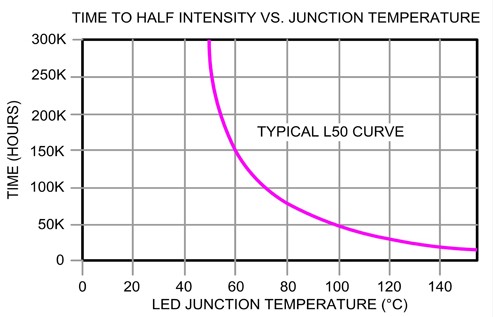 每種照明設(shè)備均存在光源使用壽命問題,經(jīng)常遭遇的狀況有類似白熾燈泡的鎢絲突然燒斷,或因長時間使用而使得光源材料因逐漸老化以致變暗而故障,LED亦因組件的接面溫度而出現(xiàn)老化現(xiàn)象。所有的照明設(shè)備在提供穩(wěn)定亮度條件下,于一定使用年限后,亮度勢必會逐漸低于有效亮度之下。在不同的照明應(yīng)用裝置中,皆有使用壽命時間限制。舉例來說,當使用在路燈裝置的亮度已衰減至原先50%時,即代表使用年限,但使用在醫(yī)生內(nèi)視鏡的光源裝置可能亮度尚未衰減那么多。