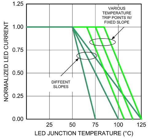 為防止組件遭受破壞或讓使用壽命縮短,必須進行熱能管理,且已有多種方法可以解決此問題。圖2為兩種不同的回折曲線,可在溫度上升時限制LED的電流流量。當接面溫度保持在默認溫度范圍內(nèi)時,就經(jīng)由主要的控制回路作為電流調(diào)節(jié);但當接面溫度超過默認范圍時,就會使用另一組控制回路限制電流大小。其中接面溫度的回折點與驅(qū)動電流的衰減率,均可依照不同的應(yīng)用和LED制造商的建議改變。