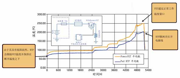 圖2. 在一次慢性熱失控情況下,RTP器件會跟蹤powerFET溫度,直到它在200°C時斷開電路。