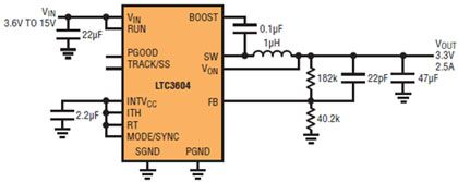 LTC3601 和 LTC3604 是高性能單片同步降壓型穩(wěn)壓器,分別能提供高達(dá) 1.5A 和 2.5A 的電流。這兩款器件在 3.6V 至 15V 的寬輸入電壓范圍內(nèi)工作,這樣的范圍涵蓋了手持式設(shè)備、PC 以及汽車中使用的電池化學(xué)組成。它們獨(dú)特的恒定頻率 / 受控接通時(shí)間架構(gòu)提供 20ns 的最短接通時(shí)間,非常適用于需要高開(kāi)關(guān)頻率和快速瞬態(tài)響應(yīng),同時(shí)能保持高效率的高降壓比應(yīng)用。
