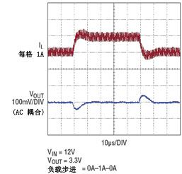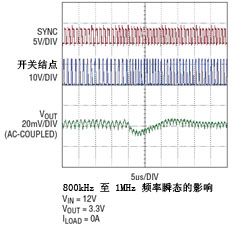 有些應(yīng)用在工作時(shí)要求移動(dòng)開(kāi)關(guān)頻率,通常是為了避開(kāi)相鄰無(wú)線接收器的干擾。圖 3 顯示了甚至當(dāng) MODE/SYNC 引腳引入的同步頻率迅速變化時(shí),輸出電壓的偏離也是很小。