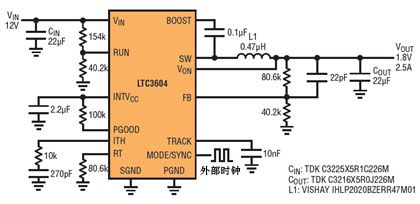 工作頻率在 800kHz 至 4MHz 范圍內(nèi),可用一個(gè) RT 到地之間的外部電阻器編程。就開(kāi)關(guān)噪聲敏感應(yīng)用而言,LTC3601 和 LTC3604 可在相同的頻率范圍內(nèi)從外部同步,而不管 RT 的狀態(tài)如何。無(wú)需外部 PLL 組件實(shí)現(xiàn)同步。