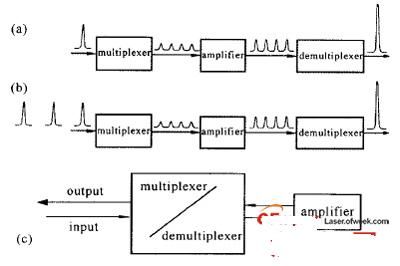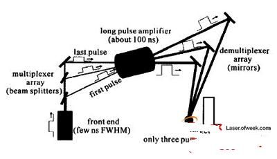 對(duì)于準(zhǔn)分子激光放大器,由于激活介質(zhì)的上能態(tài)儲(chǔ)能時(shí)間很短,必須連續(xù)補(bǔ)充瞬態(tài)儲(chǔ)能(Em)才能獲得高能輸出,即E=EmT/t,其中T是增益時(shí)間,t是增益恢復(fù)時(shí)間。對(duì)于電子束泵浦的準(zhǔn)分子激光放大器,增益時(shí)間可以長達(dá)200ns,T/t≈100,這意味著對(duì)于單個(gè)要放大的短脈沖,只能提取出很小一部分能量。為了持續(xù)提取出放大器中的儲(chǔ)能,通常使用光學(xué)多路編碼技術(shù)。