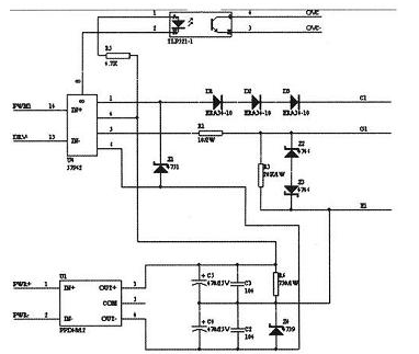 逆變器驅動電路采用日本三菱公司為驅動IGBT設計的專用集成電路M5 7962L,加少量外圍元件構成。N87C196MC輸出SPWM信號通過外圍電路放大后直接給驅動模塊,驅動模塊直接驅動IGBT管,最大可驅動400AIGBT。當M57962L檢測到IGBT管上C、E極電壓高與8V,而且此時IGBT管開通時,持續(xù)時間大于2.5 μ s,則發(fā)出故障信號,同時封鎖驅動波形,并且發(fā)出故障信號給N87C196MC,單片機產生EXTINT中斷,封鎖各路SPWM信號,高速關斷IGBT。